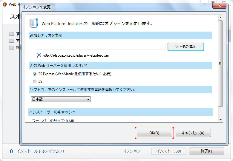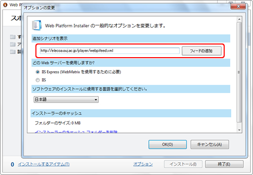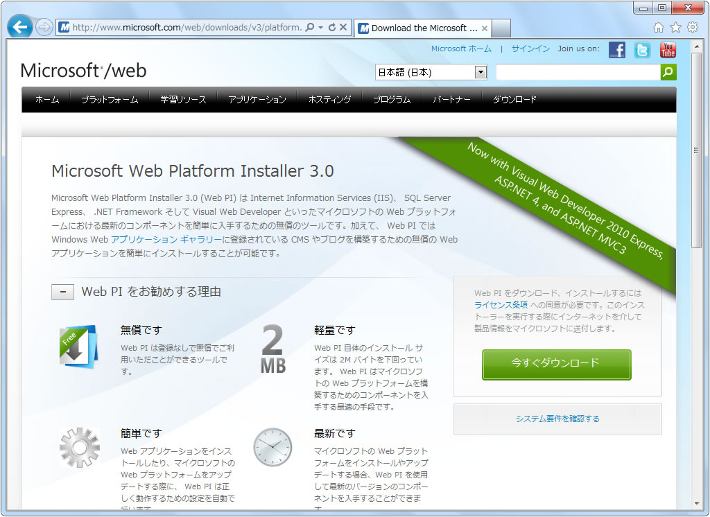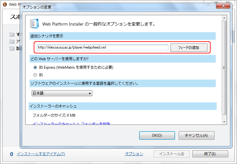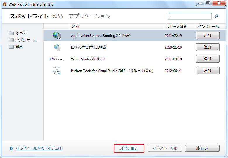 http://www.microsoft.com/web/downloads/v3/platform.aspx から、Web PI3.0をダウンロードします。注意するところは、登録する「追加シナリオ」のXMLファイルが、Web PI4.0に対応していないため、3.0でなければなりません。