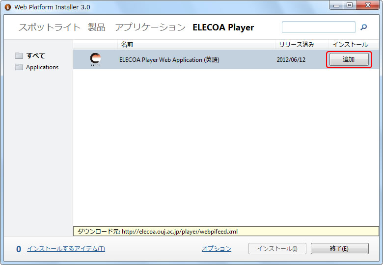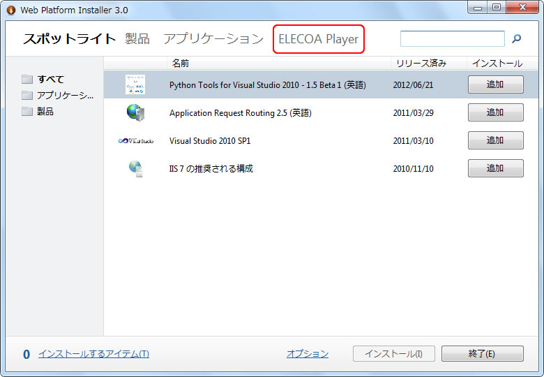 単体動作版のELECOA Playerをインストールしてみましょう、一番簡単な方法は、Microsoft Web Platform Installer3.0(Web PI)を利用する方法です。