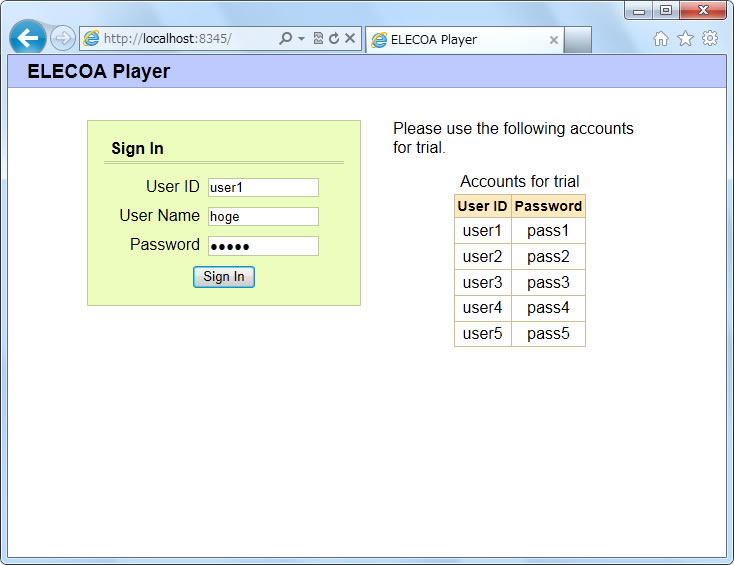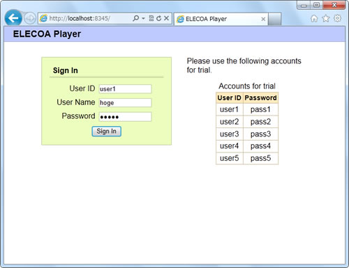 指定のアドレスをブラウザで開くと、ELECOA Playerが起動します。