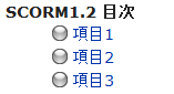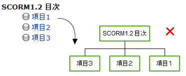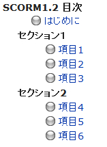 こうして作られた学習資源の集合は、どのような順番で提示するか学習の順番を決めます。フラットな並びでも、また1つの学習項目でも構いませんが、本の目次のような、章節項といった入れ子の階層構造も作ることができます。この体系化された構造のことをコンテンツモデルと言います。SCORM1.2では、学習の進行は、上から下へ(章→節→項)とリニアに進んでいきます。